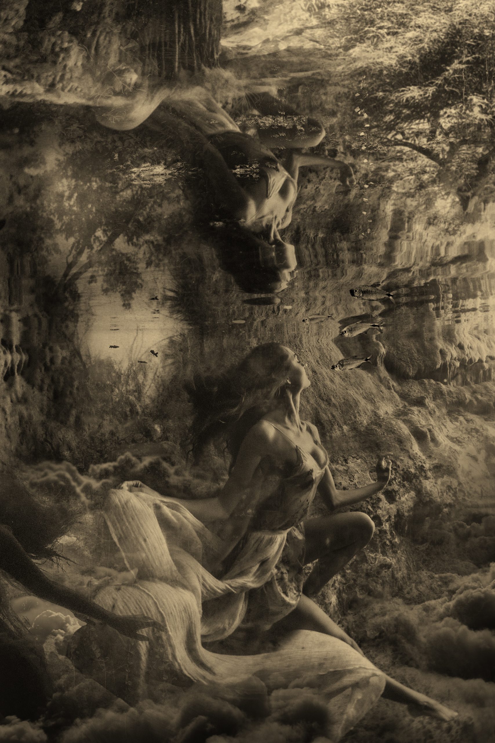 Part of my ‘Divinity’ collection, Proserpina is named after the Roman goddess and queen of the underworld. Combining soft, long exposure underwater photographs, captures of the jungle canopy above and also with hand drawn elements. All gathered and inspired from my travels to Mexico.